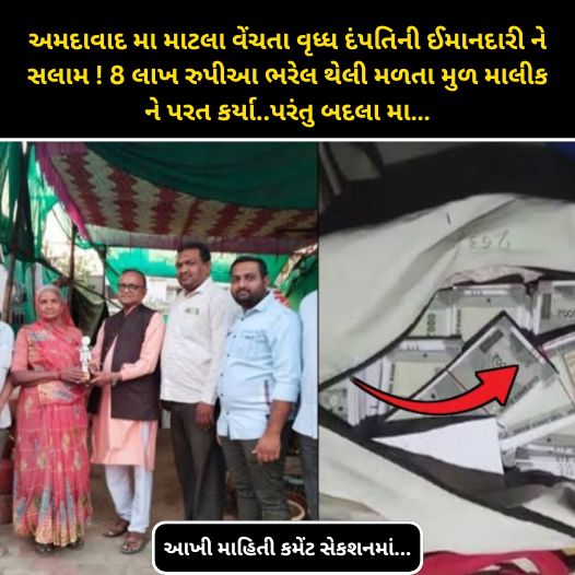 અમદાવાદ મા માટલા વેંચતા વૃધ્ધ દંપતિની ઈમાનદારી ને સલામ ! 8 લાખ રુપીઆ ભરેલ થેલી મળતા મુળ માલીક ને પરત કર્યા..પરંતુ બદલા મા…
