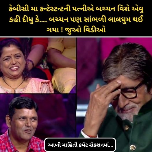 હાલમાં કોન બનેગા કરોડપતિ શો અંગે સોશિયલ મીડિયામાં અનેક પ્રકારના વીડિયો વાયરલ થતા હોય છે. હાલમાં જ એક એવી ઘટના બની છે કે, જાણીને તમને પણ આશ્ચય થશે. વાત જાણે એમ છે કે, કેબીસી મા કન્ટેસ્ટન્ટની પત્નીએ બચ્ચન વિશે એવુ કહી દીધુ કે.બચ્ચન પણ સાંભળી લાલઘુમ થઈ ગયા ! ચાલો અમે આપને આ હાસ્યજનક ઘટના વિશે વિગતવાર માહિતી જણાવીએ.