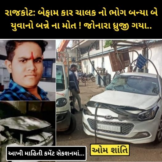 ઘટના અંગે જાણવા મળતી વિગતો અનુસાર રાજકોટના ગોંડલ રોડ પર મક્કમ ચોક પાસે આવેલી રાજ પાઉભાંજી પાસે મુખ્ય રોડ પર કાળ બનીને આવેલી આઈ20 કારે બે યુવકોને ઉલાળતા તેઓ દૂર સુધી ફંગોળાયા હતા બન્ને યુવાનો ને માથા ના ભાગે ગંભીર ઈજાઓ પહોચતા તાત્કાલિક સારવાર માટે હોસ્પિટલ એ ખસેડવા મા આવ્યા હતા જ્યા તેમનુ કરુણ મોત થયુ હતું. જ્યારે બીજી બાજુ કાર ચાલક ટક્કર મારી ને નાસી ગયો હતો જ્યારે ઘટના અંગે ડીવીઝન પોલીસ મથકના સ્ટાફે કાર્યવાહી કરી હતી.