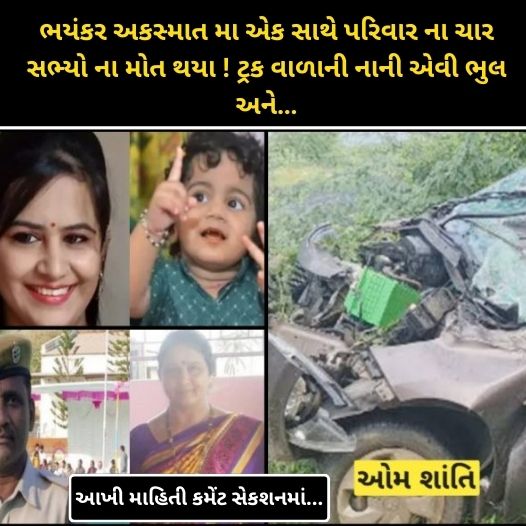 હાલ ના સમય મા અકસ્માત ની ઘટના ઓ સતત બની રહી છે ખાસ કરી ને હાઈ વે પર કોઈ સિગ્નંલ વગર જ ગાડી ઉભી રાખી દેતા બેદરકાર લોકો ના લીધે ઘણા અકસ્માતો બની રહ્યા છે ત્યારે ફરી એક એવી અકસ્માત ની દુખદ ઘટના સામે આવી છે જેમા ગોસ્વામી પરિવાર ના એક સાથે ચાર લોકો ના મોત થતા અરેરાટી મચી ગઈ હતી. જ્યારે હાલ ગોસ્વામી પરીવાર ના બે સભ્યો સારવાર હેઠળ છે.