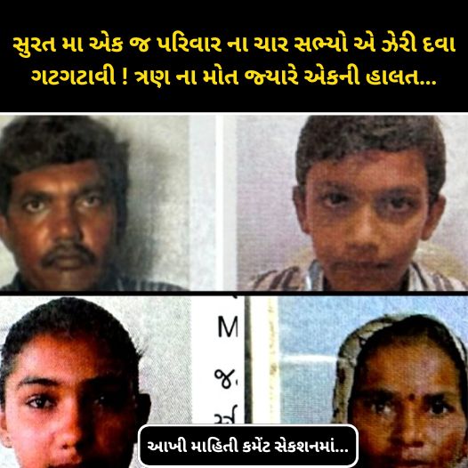 ગુજરાતમાં રડાવી દે તેવો બનાવ બન્યો છે.વોચ ગુજરાતના અહેવાલ પ્રમાણે જાણવા મળ્યું છે કે, સુરત મા એક જ પરિવારના ચાર સભ્યો એ ઝેરી દવા ગટગટાવી! ( Gujarat )આ ઘટના અંગે વધુ વિગતવાર માહિતી આપીએ.આ ઘટના સુરત શહેરમાં બની છે. આ ઘટનાને કારણે સુરત શહેરમાં ચકચાર મચી ગયો છે. ઘરના દરેક સભ્યોનો એકી સાથે આપઘાતનો બનાવ સામે આવતા જ સૌ કોઈનું હૈયું કંપી ગયું છે. (Family)આ પરિવારે ક્યાં કારણે આપઘાત કર્યો તે જાણીએ.